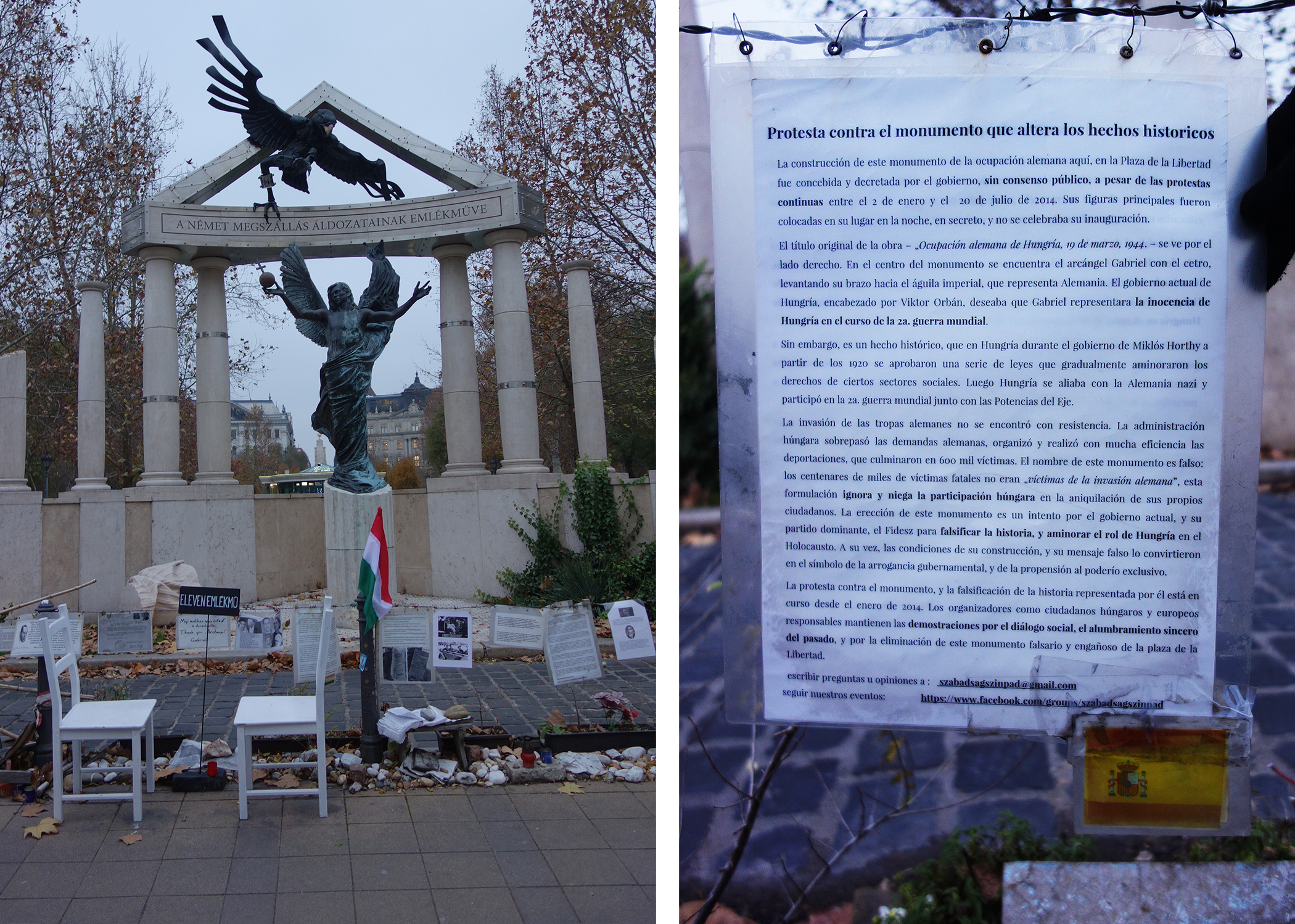 Por último indicar que, aunque habíamos estado ya en Budapest, no nos hemos saltado la visita al Parlamento y sus alrededores que son preciosos. En la plaza de la Libertad encontramos un monumento curioso que es tema de discusión desde hace años, y es que como estrategia política se modificó el mensaje que aparecía en el mismo para vender la ocupación alemana como víctimas y no como colaboradores. Si hacéis click en la foto, podréis ampliarla para leerlo mejor: