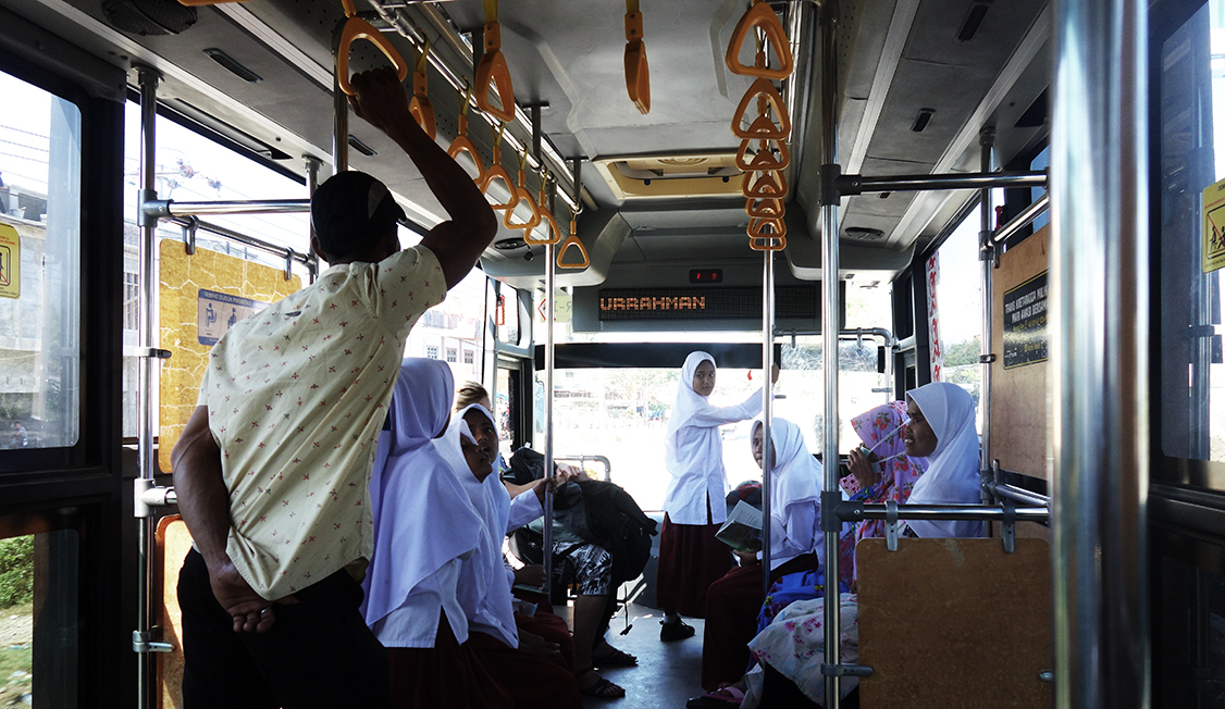 Existen unos autobuses gratuitos llamados “Trans Kutaraja” y las señales que indican dónde cogerlos dicen “Koetaradja”. Son autobuses azules, grandes y bastante nevos, los que nosotros cogimos eran muy altos, como de dos plantas, y las paradas elevadas en una plataforma a la misma altura. Para ir a la Gran Mezquita Baiturrahman hay dos líneas, que si las conectas te llevan del aeropuerto al puerto.