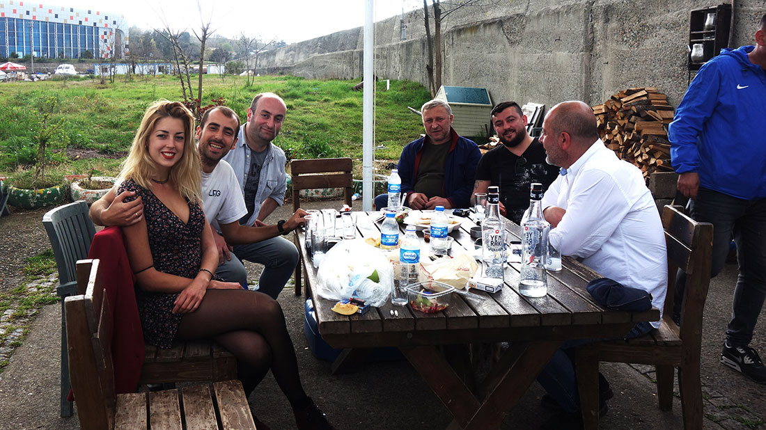 Tuvimos suerte de contactar con el amigo Rahmi, y desde Marmaris nos organizó las comodidades en Trabzon, ciudad donde se encuentran todos sus primos. Tras “La llamada”, en seguida llegaron los coches de los primos de La Familia (Hasan, Rifat, & Company) y nos llevaron a su Hangar para que dejáramos la Duranga a salvo, bien vigilada. En el hangar tiene su espacio de recreo, sus yates aparcados y su caravana llena de Raki, a modo de bar. Lo mejor de todo, es que comparten su espacio con la policía, que es aquí donde hacen sus prácticas de moto.