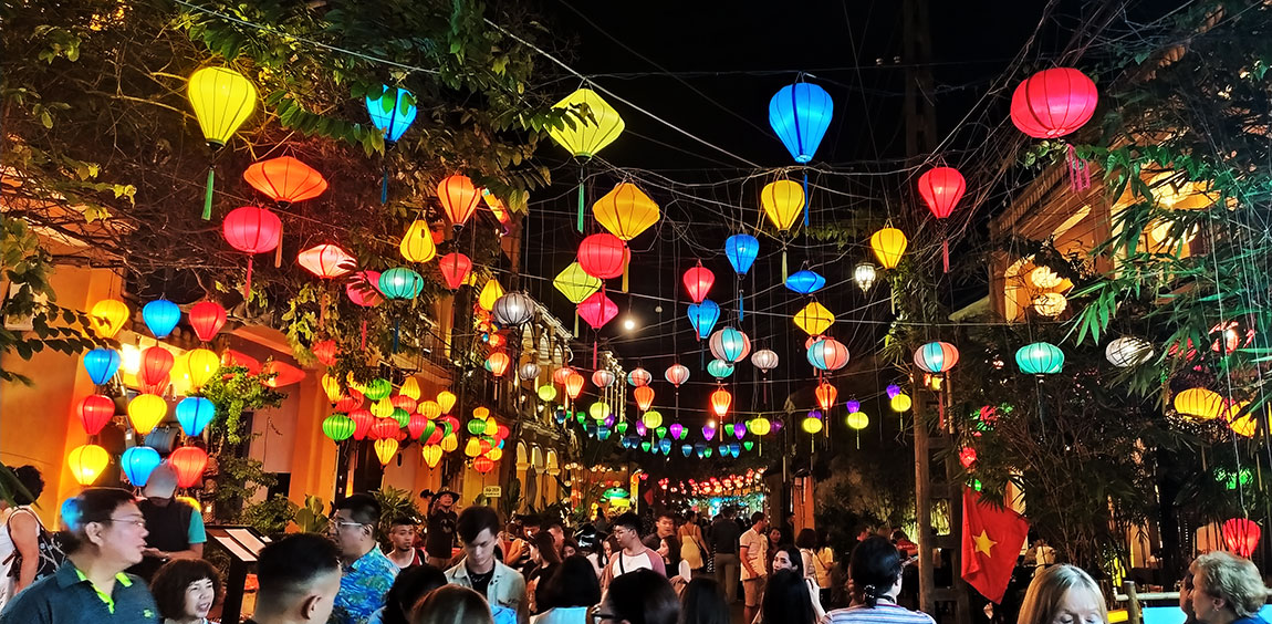 A la hora del atardecer todo el mundo se dirige a la zona del puerto para ver cómo comienzan a iluminar los farolillos de colores a lo largo del río. Además, puedes observar las barcas adornadas con farolillos que pasean a los turistas por el río y las candelas que flotan en el agua. Si cruzas el puente Cau An Hoi encontrarás la zona de más ambiente de Hoi An todas las noches. Allí podrás cenar pinchos y platos tradicionales en puestos de comida callejera. Para los que buscan fiesta encontrarán donde bailar a partir de las 22:00 en todos los bares paralelos al río.
